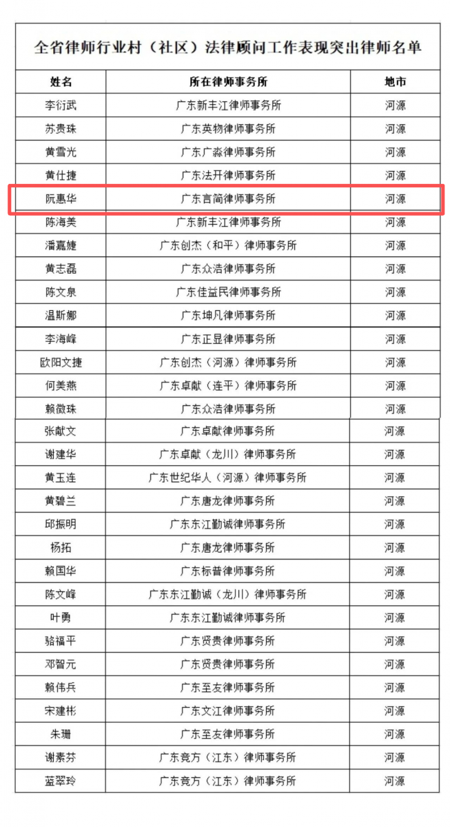 为深入贯彻落实党中央关于全面推进依法治国和乡村振兴战略的决策部署,积极助力“百千万工程”建设,充分肯定村(社区)法律顾问工作成效,经十二届广东省律师协会第11次常务理事会审议通过,省律协对全省担任村(社区)法律顾问工作中表现突出的律师予以通报表扬。其中,我所阮惠华律师因在村(社区)法律顾问工作中表现优异,荣获省律协通报表扬。